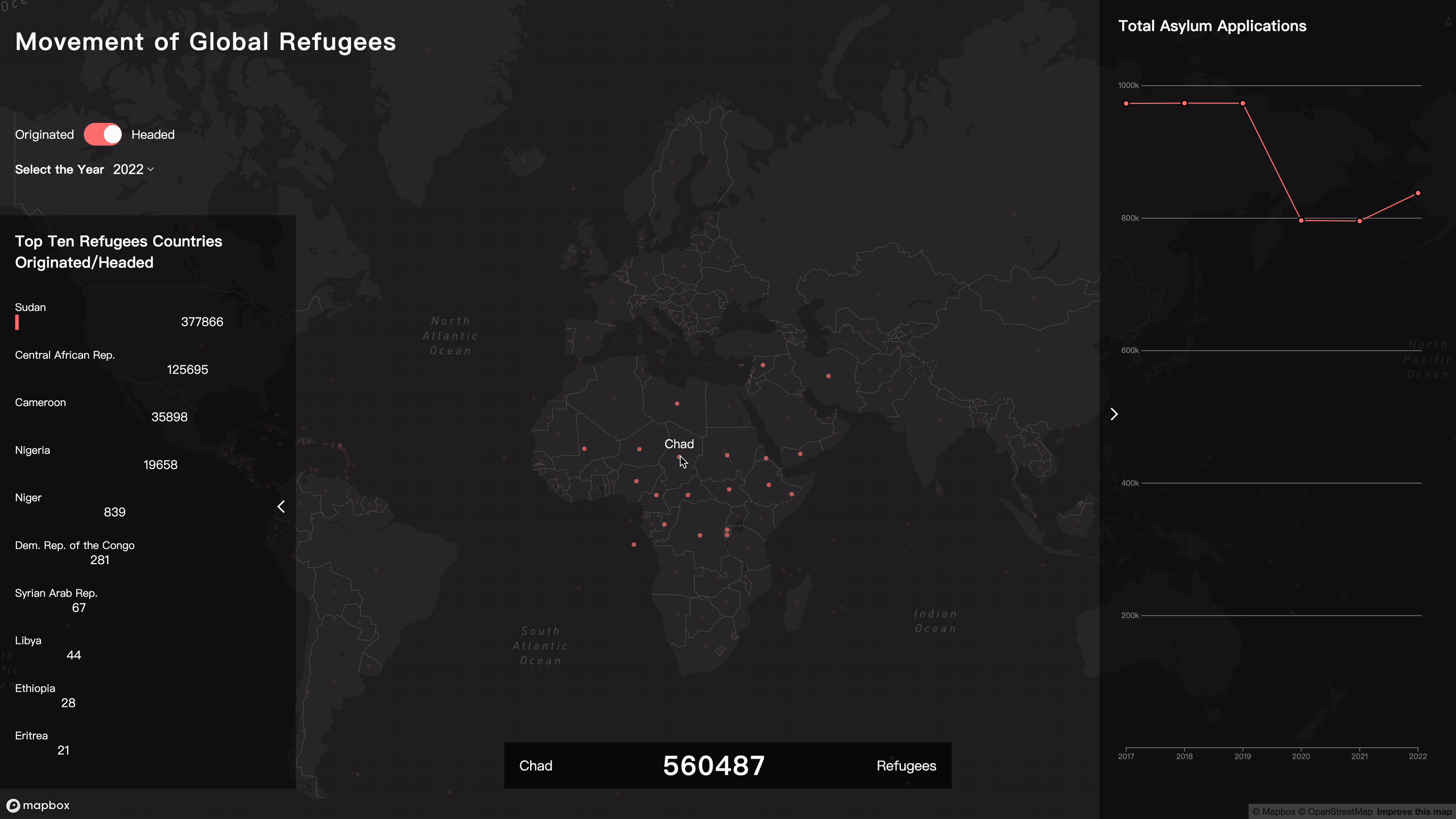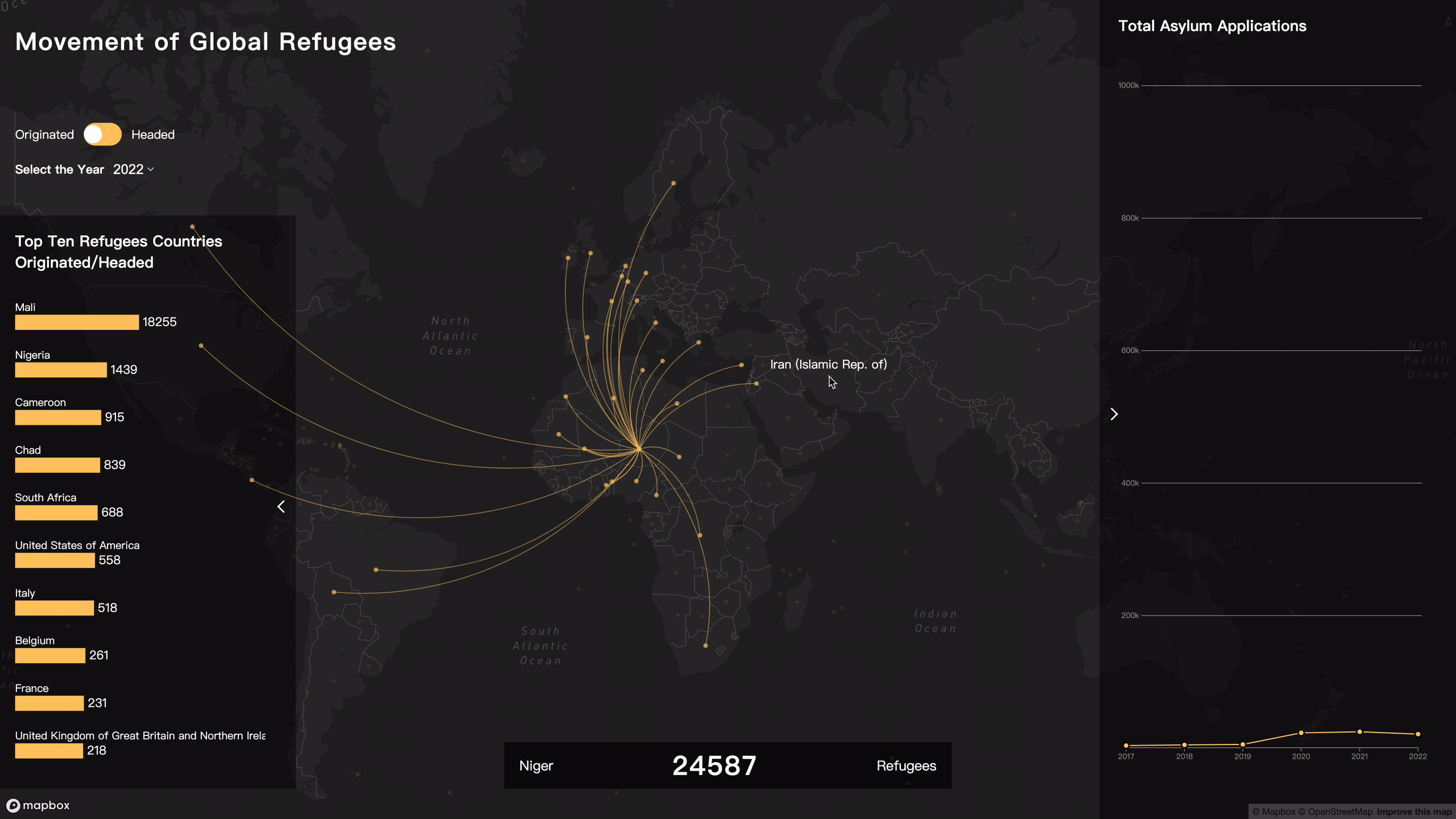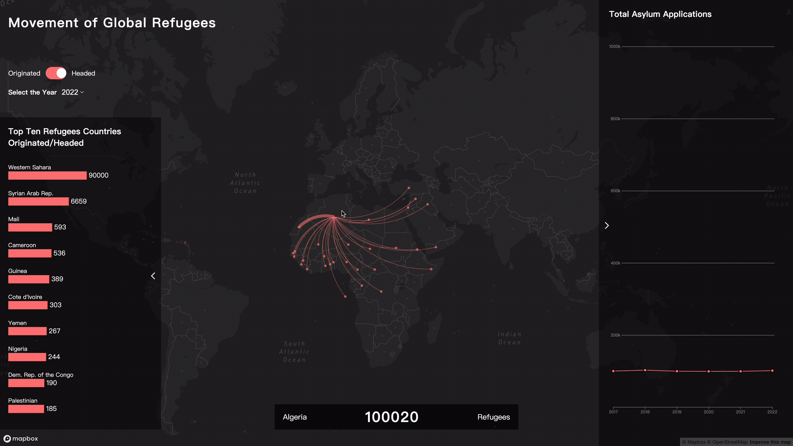 According to the UNHCR, in 2022, global forced displacement has risen to 103 million. Over 70% of the global refugees under UNHCR’s mandate and others desperate for international protection come from just five countries. This interactive mapping dashboard tries to depict an overview of this miserable situation; The trajectories and bar charts show the paths and numbers of refugees originating from or heading to.
